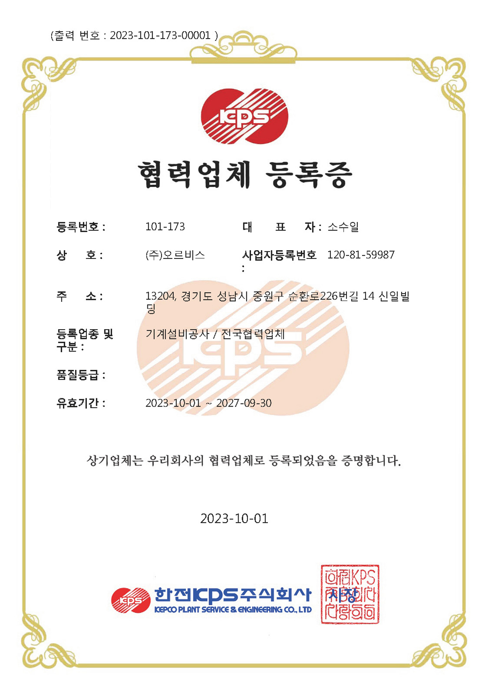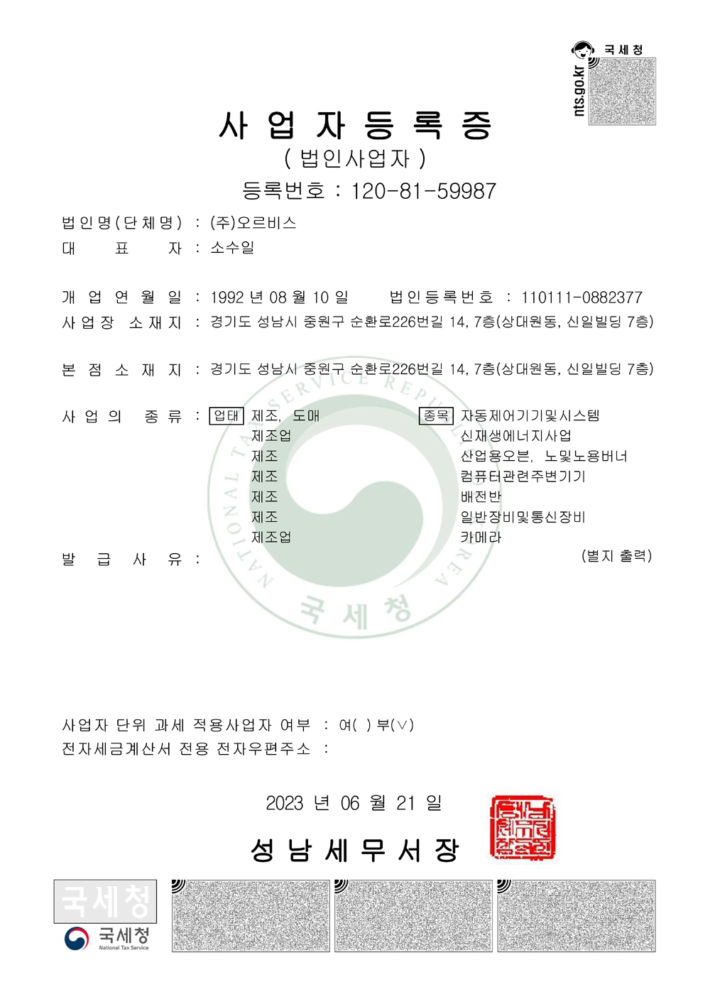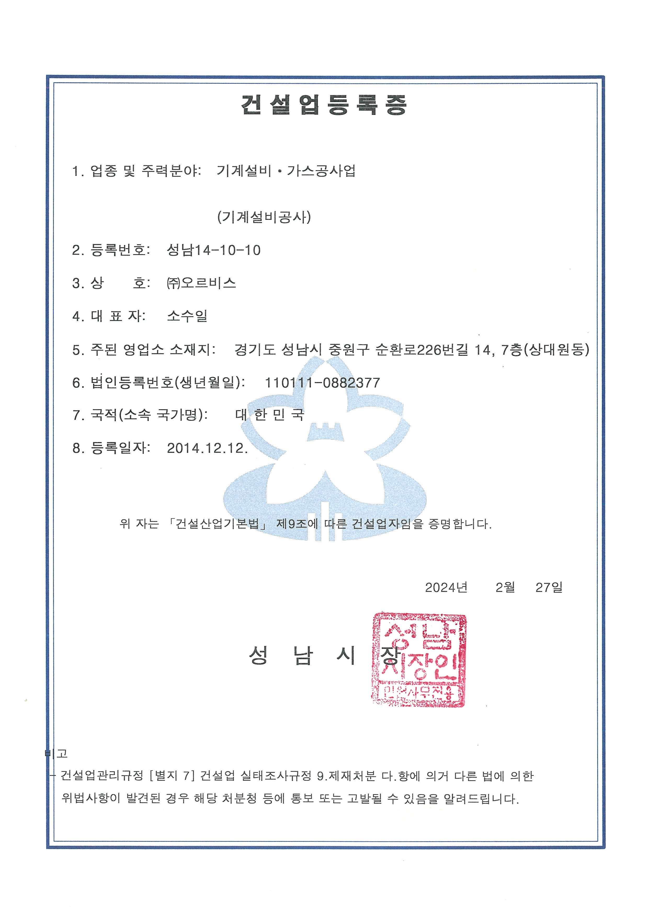 사업자등록증 기술혁신형 중소기업(INNO-BIZ) 확인서 중소기업확인서 벤처기업확인서 기업부설연구소 인정서 전기공사업등록증 기계설비공사업등록증 소방시설공사업등록증 정보통신공사업등록증 엔지니어링사업자신고증 감리업등록증 측정기기 관리대행업 등록증 한전KPS 협력업체등록증(계측제어) 한전KPS 협력업체등록증(전기공사) 한전KPS 협력업체등록증(기계설비공사) KOMIPO BEST 100 상생협력사 인증서 한국수력원자력 - 유자격 공급업체 대리점 업체 등록증